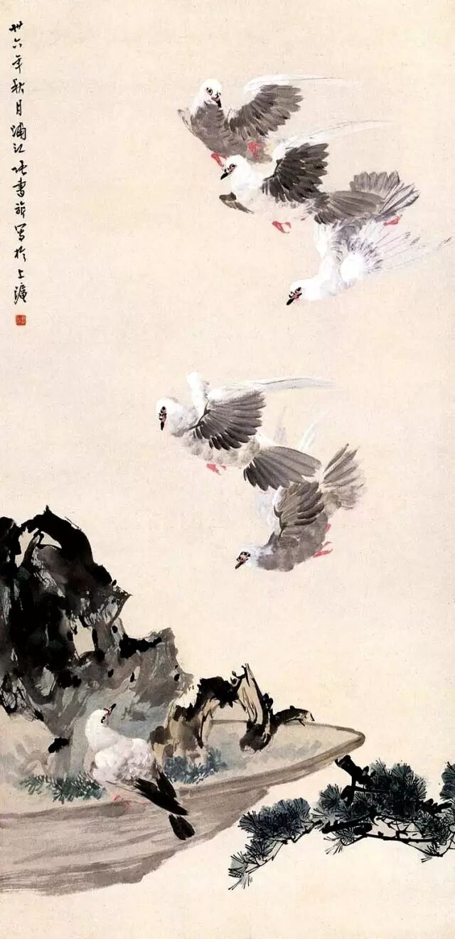 我有幸藏有一幀條幅,條幅將高劍父與張書旂兩師徒的兩幅畫作同裱在此條幅上。上為高劍父畫鷹的扇面,下為張書旂用白粉蘸色點染的白鴿。此畫解放初期流入北京琉璃廠而購得。